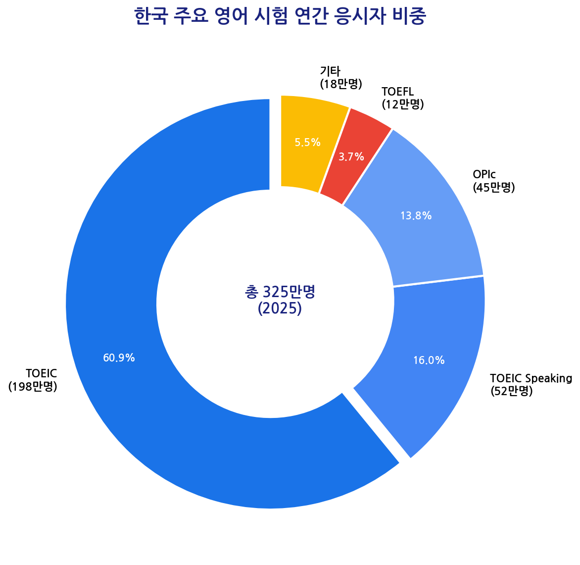 한국 주요 영어 시험 연간 응시자 비중 (2025년 기준)